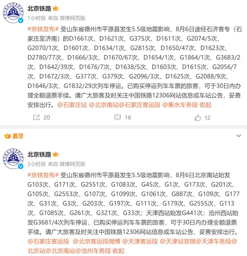 据@北京铁路 消息,受山东省德州市平原县发生5.5级地震影响,8月6日途经石济客专(石家庄至济南)的D1661次、D1621次、G375次、D1611次、G2074/5次、G2070/1次、D1601次、D1634/1次、G2815次、D1650/47次、D1623次、D2780/77次、D1666/3次、D1670/67次、D1654/1次、G1864/1次、G3683/2次、D1642/39次、D1676/7次、D1638/5次、D1603次、D1615次、G2056/7次、D1672/3次、G377次、G379次、G2096/3次、D1625次、G2088/9次、D1646/3次、G1832/29次列车停运。已购买停运列车车票的旅客,可于30日内办理全额退票手续。请广大旅客及时关注中国铁路12306网站信息或车站公告,妥善安排出行。