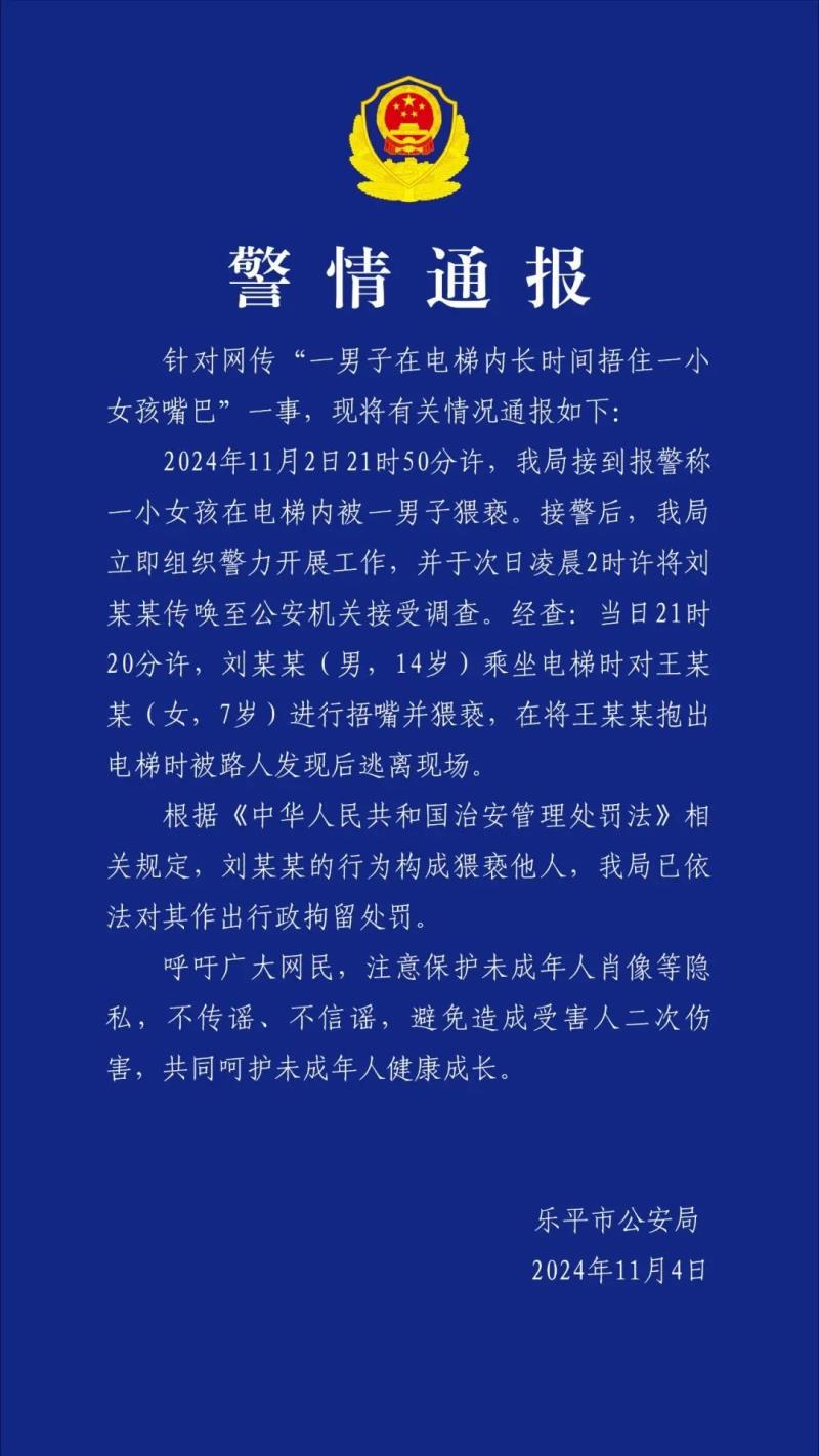 2024年11月2日21时50分许,江西乐平市公安局接到报警称一小女孩在电梯内被一男子猥亵。接警后,该局立即组织警力开展工作,并于次日凌晨2时许将刘某某传唤至公安机关接受调查。经查:当日21时20分许,刘某某(男,14岁)乘坐电梯时对王某某(女,7岁)进行捂嘴并猥亵,在将王某某抱出电梯时被路人发现后逃离现场。