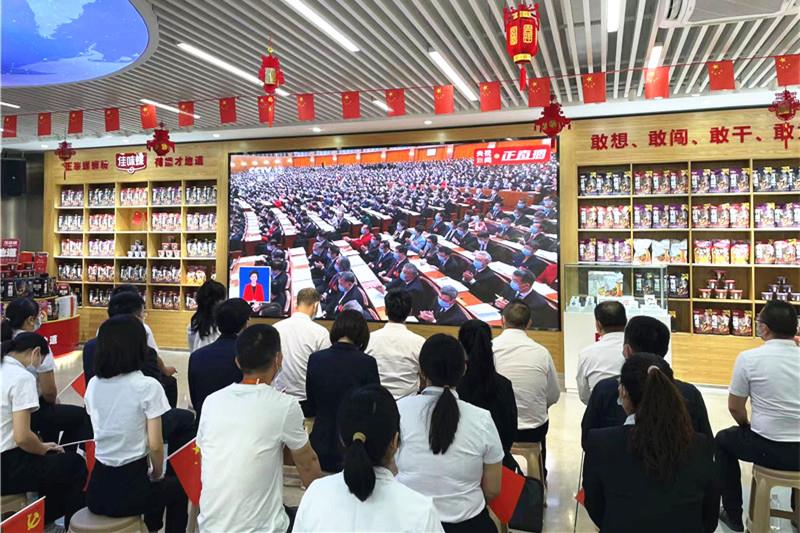 ▼在柳州螺蛳粉生产集聚区,广西善元食品有限公司组织30多名员工,在公司大厅集中收听收看党的二十大开幕会。