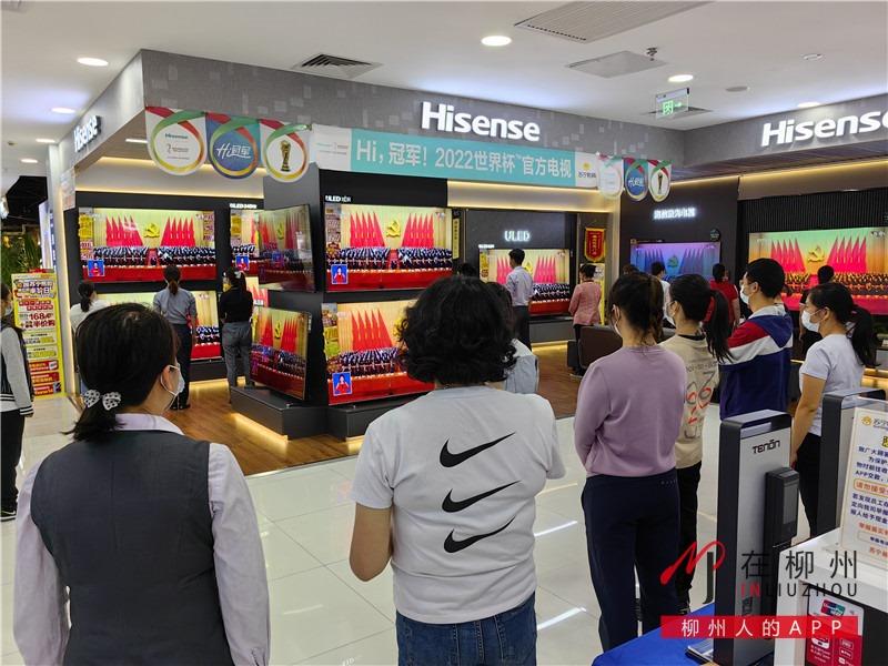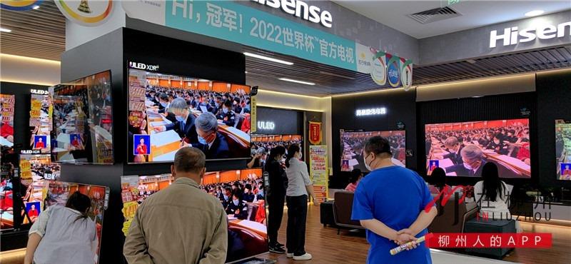 ▼在柳州百货五星商厦八楼的家电区,许多逛商场的市民驻足在电视机前,怀着无比激动的心情收听收看党的二十大开幕会直播盛况。