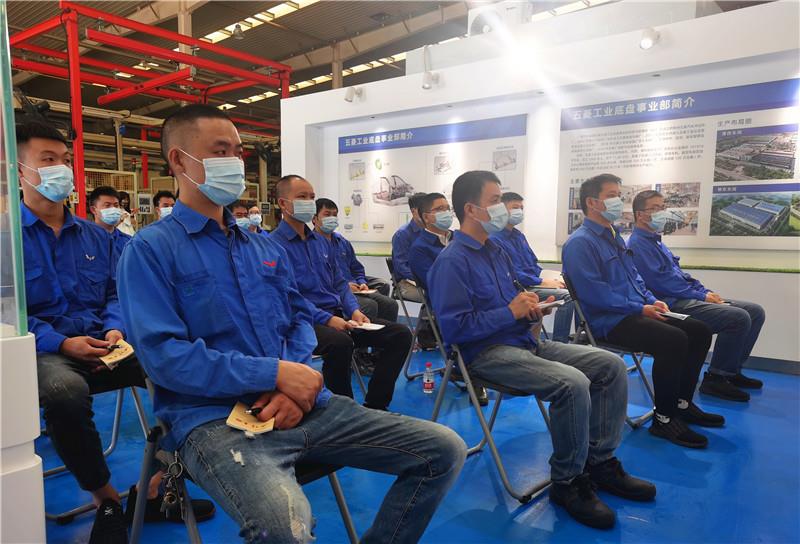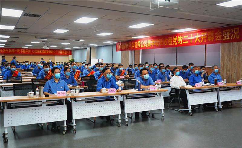 ▼在柳州五菱柳机动力有限公司,干部职工坐在一起收听收看党的二十大开幕会。