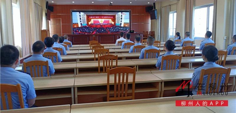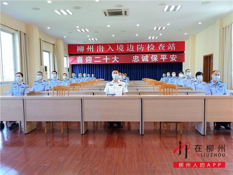 ▼中华人民共和国柳州出入境边防检查站全体民警坐在屏幕前集中收听收看党的二十大开幕会。