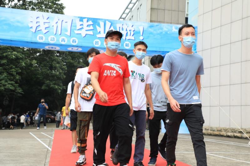 踏着红毯、经过体育馆一楼的毕业门,测温、扫码,登顶可见4楼毕业典礼舞台上,三个文艺节目正在表演,之后毕业典礼正式开始。