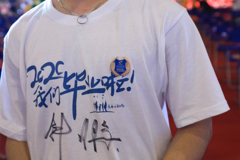 领到毕业证书的毕业生走下舞台后久久不忍离开,他们或击掌互贺,或在毕业纪念衫上互相“涂鸦”,或到留言板上留言。有三三两两合影留念的,有与领导老师在舞台上留下难忘“毕业照”的……