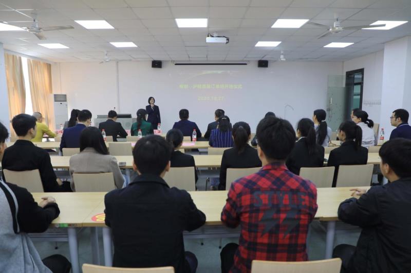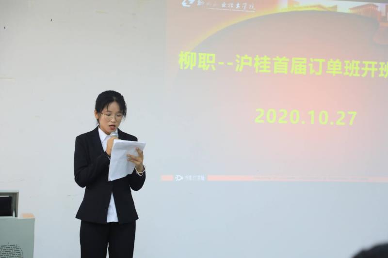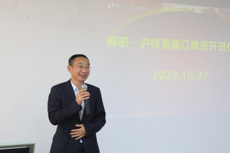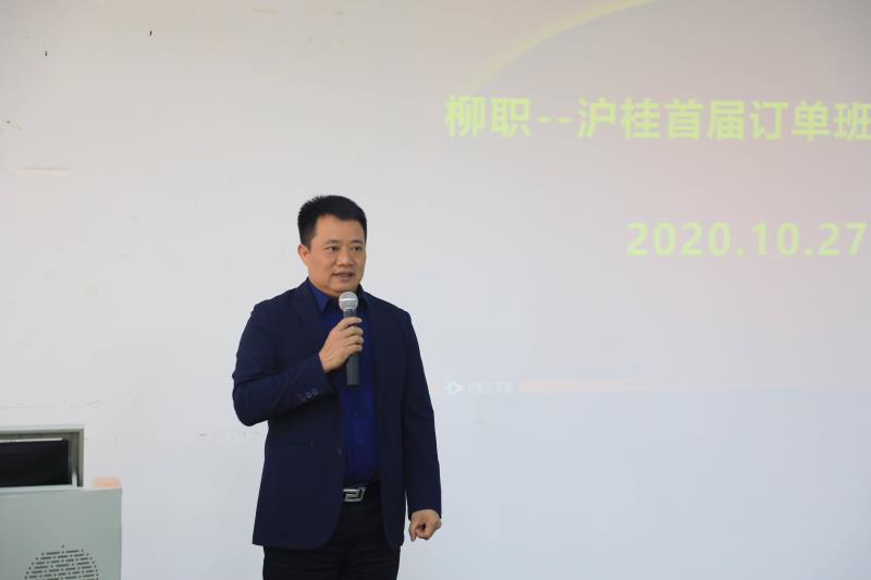 今天成立的订单班是首个订单班,接着还会有更多的订单班合建。感谢16位同学选择了“沪桂”,“ 沪桂”从研发到电商将近有800多人,研发团队中有比较高端的人才。希望同学们耐得住寂寞,在学习过程中要立足岗位,找准自己的人生目标,战胜自己。“既然选择了远方,就只能风雨兼程”。大家要学会售前、售中、售后环节的运营,抢占市场、发展市场。企业会给大家比较大的发展空间。