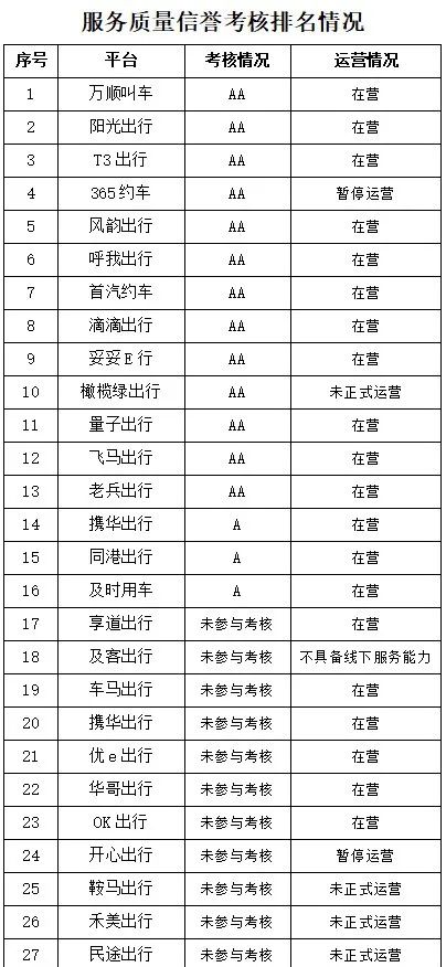 通过对2022年我市已正常运营的17家网约车平台企业,按照《出租汽车服务质量信誉考核办法》进行考评,形成2022年网约车服务质量信誉考核排名如下↓