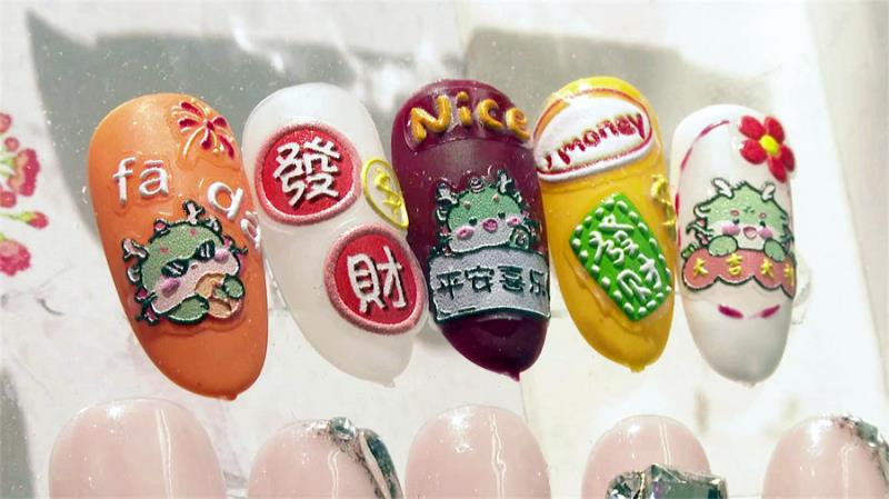 美睫美甲店店员:“我们这里专门服务会员,以预约为主。美甲大多做红色的猫眼、贴钻,或者是醒狮。因为龙年画点龙,贴点贴纸这种就比较多一些。美睫单根会种得比较多,因为比较自然,像回去见长辈也不能搞得太花哨。”
