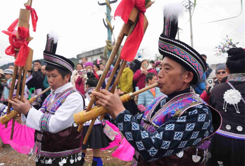 (通讯员 龙涛 龙林智)2月25日是正月十六,柳州市融水苗族自治县香粉乡举行传统的正月十六“古龙坡会”,来自十里八乡的苗、瑶、侗等少数民族群众欢聚一堂,开展吹笙踩堂、芦笙比响、斗马比赛及舞狮表演等民俗活动,祈盼风调雨顺、五谷丰登。