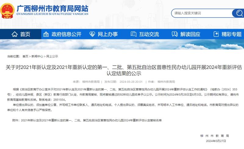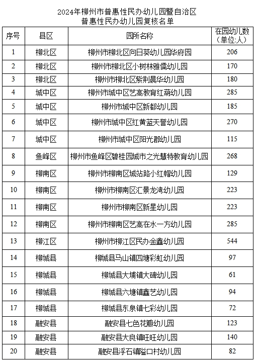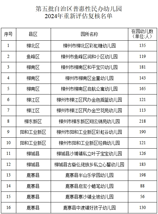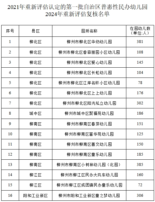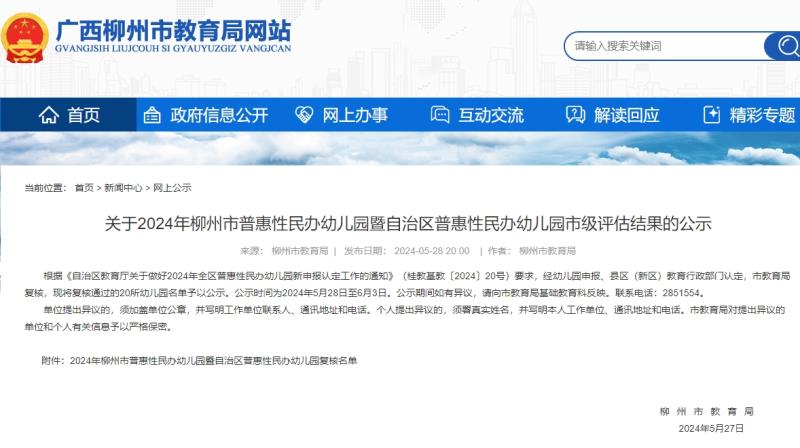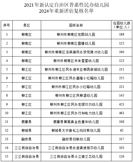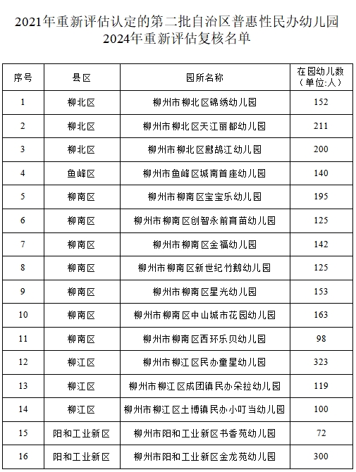 5月27日,柳州市教育局对2021年新认定及2021年重新认定的第一、二批、第五批自治区普惠性民办幼儿园开展2024年重新评估认定结果进行公示,并对2024年柳州市普惠性民办幼儿园暨自治区普惠性民办幼儿园市级评估结果进行公示。经幼儿园申报、县区(新区)教育行政部门认定,市教育局复核,分别有92所幼儿园和20所幼儿园复核通过,现予以公示。
