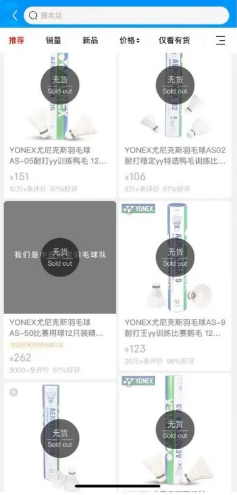 涨价的另一面是缺货。记者查询发现,以“尤尼克斯”为例,其京东自营店里的6款天然羽毛球已售罄;不过,天猫旗舰店内有三款球在售,其中320元一筒的AS-40EX定位是国际比赛用球,并非普通爱好者常用的型号。