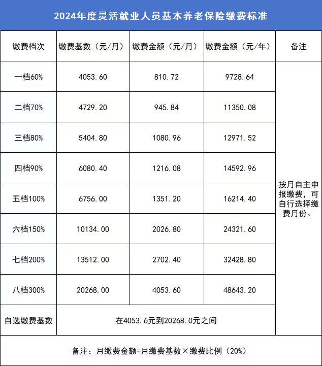 无雇工的个体工商户、未在用人单位参加养老保险的非全日制从业人员或其他灵活就业人员参加企业职工基本养老保险,可在缴费基数上下限之间选择适当的缴费基数缴费,月缴费金额=月缴费基数×缴费比例(20%)。因此,2024年参加企业职工基本养老保险的灵活就业人员可在4053.60元至20268.00元之间自主选择缴费基数进行缴费,每月最低缴费810.72元,最多缴费4053.60元。