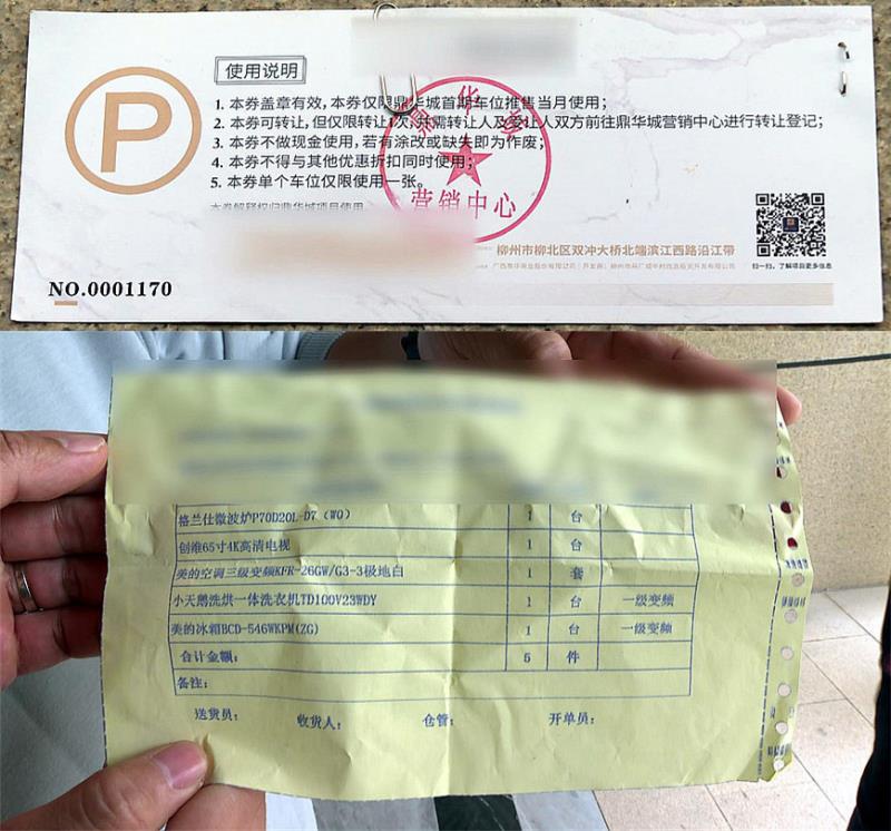 业主陆女士也跟陈先生一样,被房开的促销活动吸引买了鼎华城的房子。当时,销售人员给她送了价值一万元的家具券、一万的家电领用券,还有五年的物业费以及半价车位券等。其中,半价车位券上盖的是鼎华城营销中心的章,其他券盖的则是房开——柳州市马厂城中村改造投资开发有限公司。陆女士说,想着能直接省几万,结果现在都没有得用。