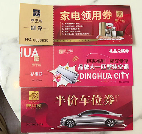 她说,今年5月,她拿着家具券和家电券到房开指定商家做了登记,排队等待,结果等了三个月也没见商家发货。陆女士说,后来她去了解了才知道,商家取消了今年8月以后的发货计划,原因是房开不给结算货款。所谓的半价车位券,也是“形同虚设”,“根本没有用,人家收房先的,买车位是五万,我们拿半价车位券去买也是五万,有什么优惠。”