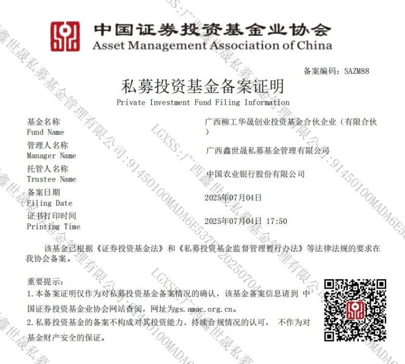 7月4日,柳工集团旗下广西鑫世晟私募基金管理有限公司(以下简称:鑫世晟)首支基金广西柳工华晟创业投资基金合伙企业(有限合伙)QFLP基金(以下简称:柳工华晟)正式通过中国证券投资基金业协会备案,备案编码:SAZM88。
